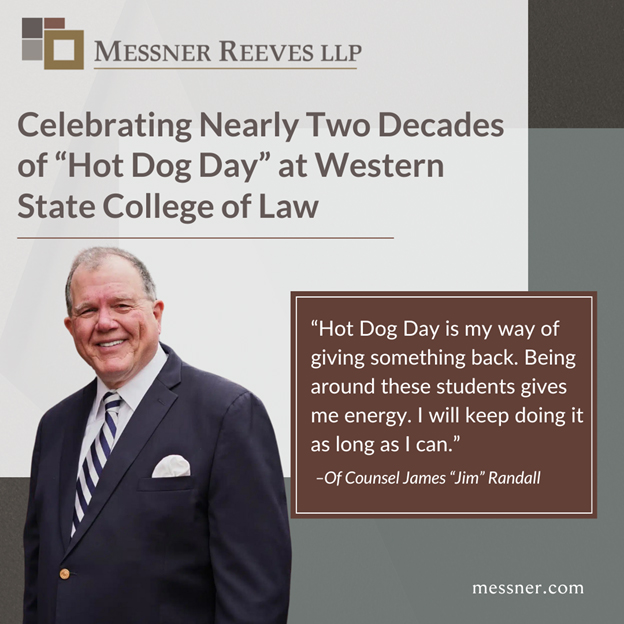 Messner Reeves LLP Of Counsel James “Jim” Randall was recently featured in an article by Western State College of Law on his nearly two decades of hosting “Hot Dog Day” as a community-bolstering event for tired and hungry law students.