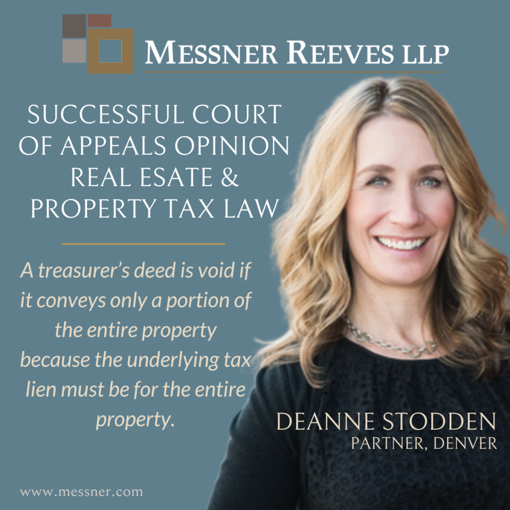 Messner Reeves LLP is pleased to announce that Real Estate Partner Deanne Stodden recently assisted in securing an important Colorado real estate opinion from the Colorado Court of Appeals.